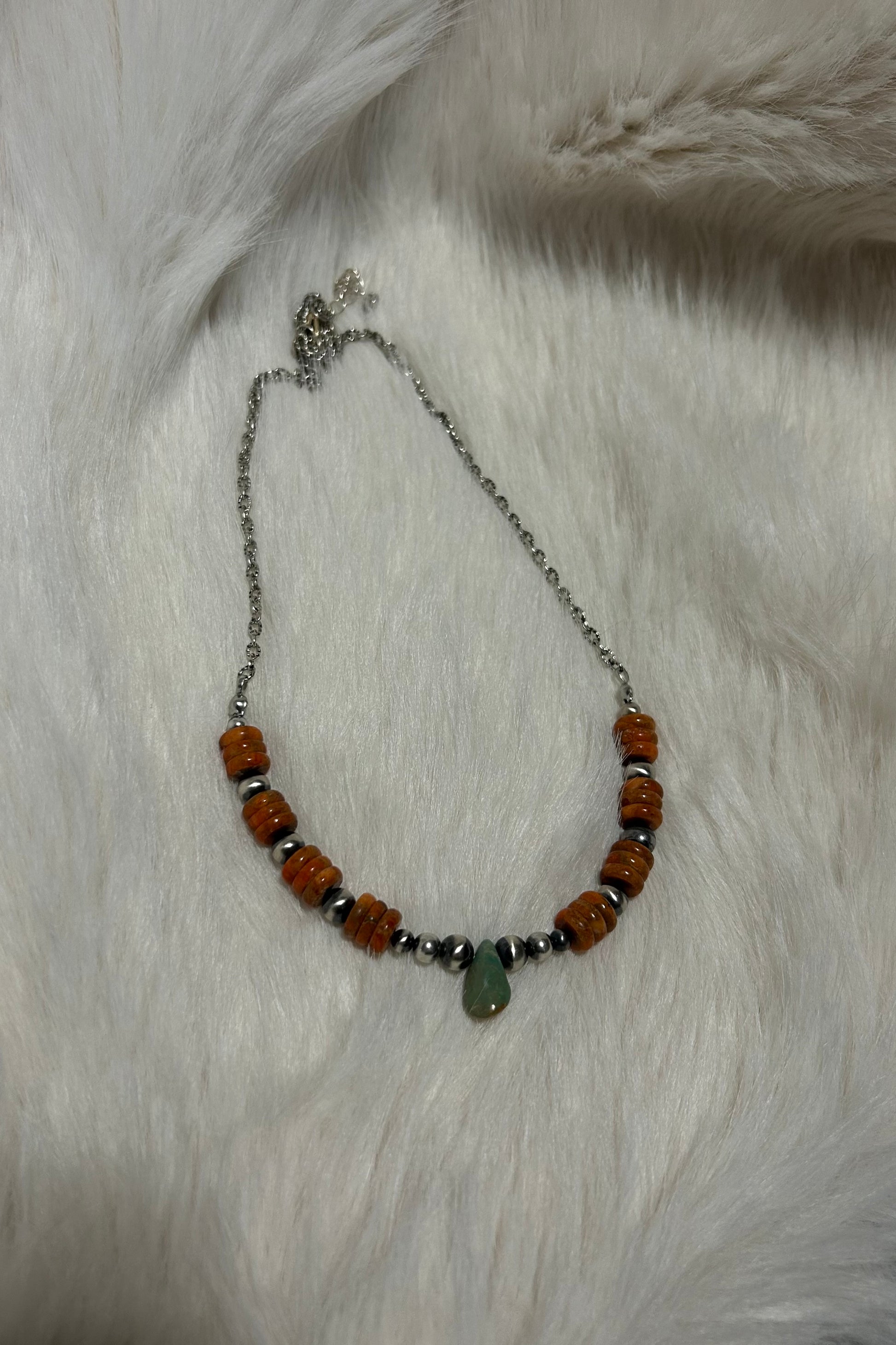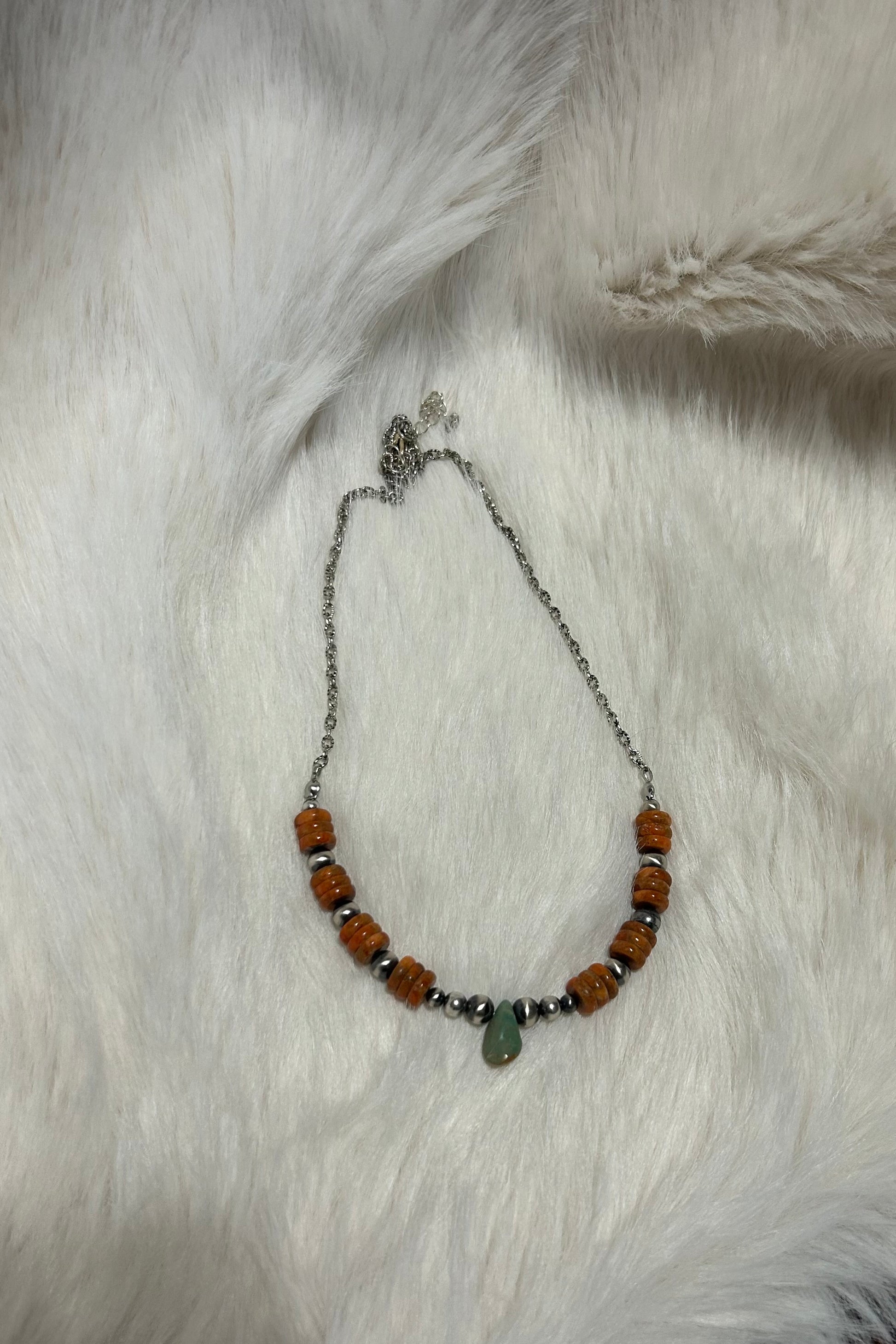 21" Necklace with Genuine Apple Coral Wafer Beads, Genuine Sterling Silver Pearls & a Genuine Natural American Turquoise Teardrop on Stainless Chain