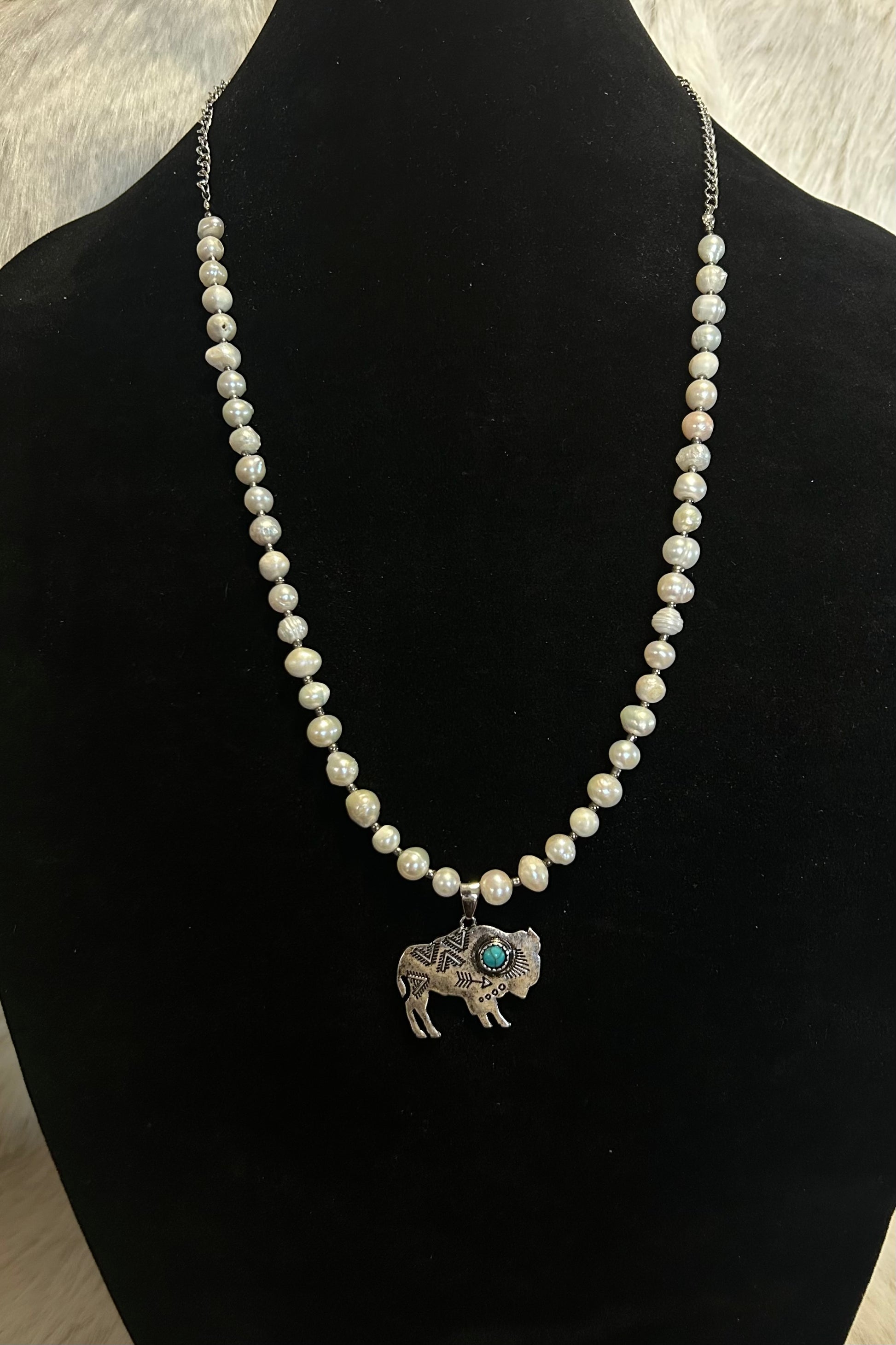 Buffalo pendant on pearls and silver spacer bead necklace. Perfect for layering.