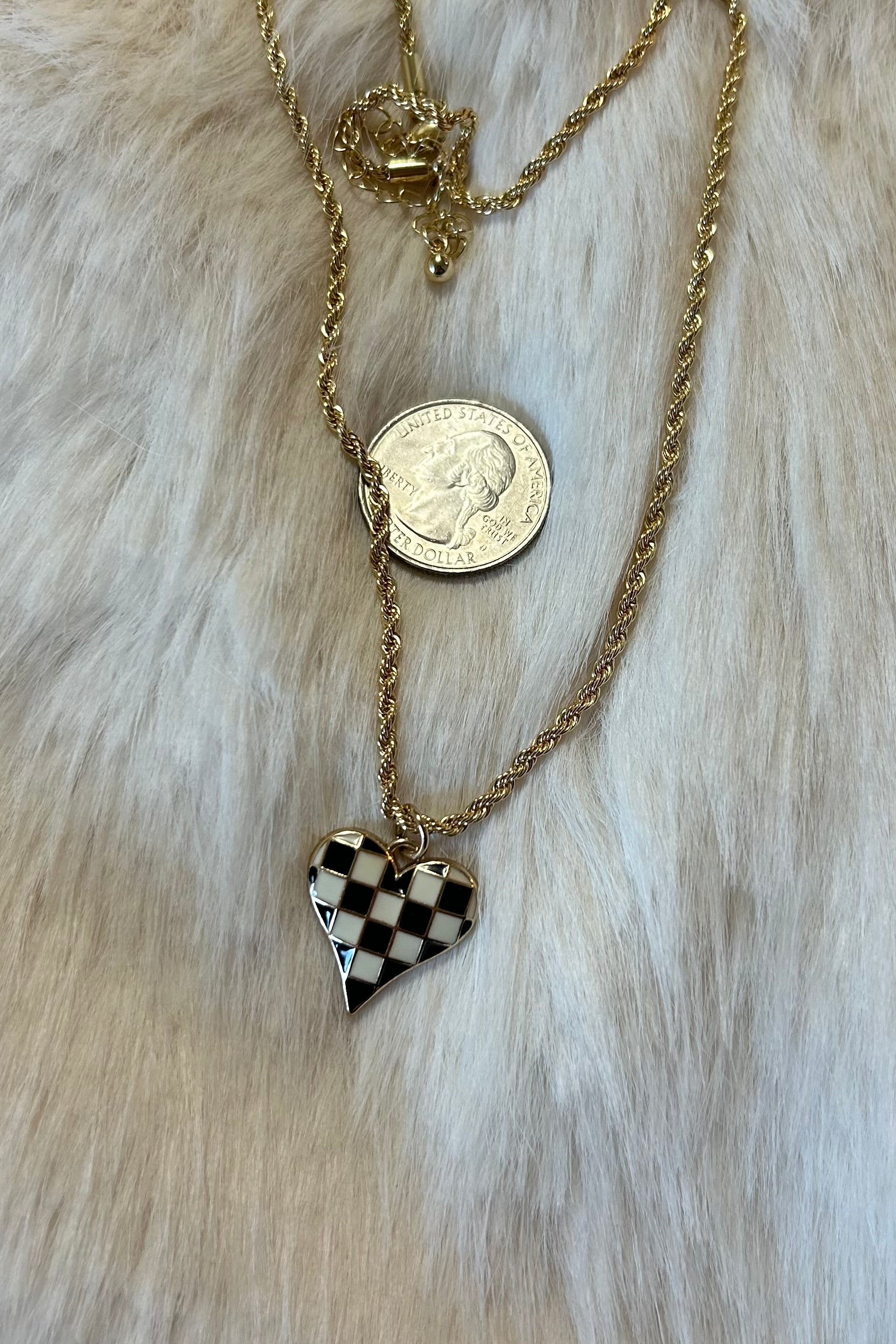 Add some checkered love to your jewelry collection with our Sawyer Necklace. Featuring a heart pendant with checker detailing on a stunning braided rope chain.
