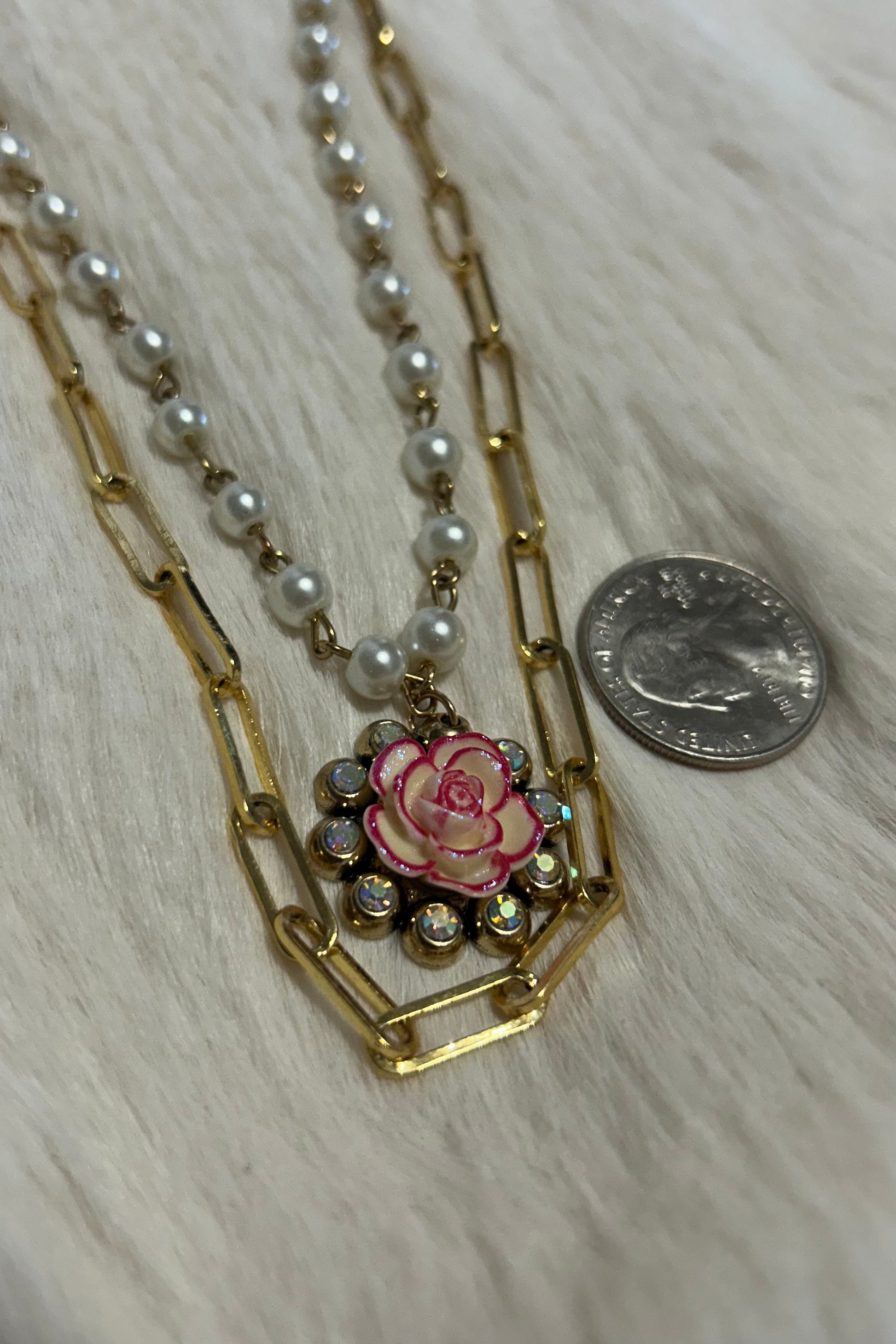 Gold Paperclip Necklace linked with a pearl & brown necklace featuring a gold and white flower pendant with pink accents.